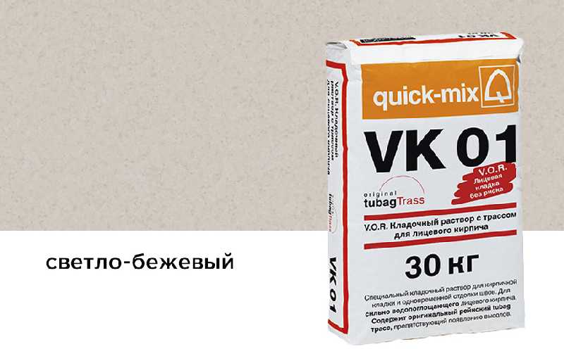 Цветной кладочный раствор quick-mix VK 01 с трассом для выполнения кирпичной кладки и одновременной отделки швов (в одном рабочем цикле) при использовании сильно водопоглощающего лицевого кирпича с водопоглощением ~ 8-10%.